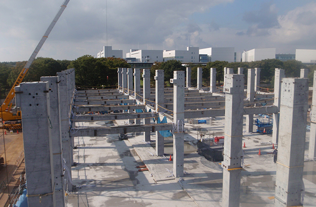 プレキャストPC工法は、工場で製作したプレキャスト部材を現場で組み立て、プレストレスを導入し躯体を構築していく工法です。