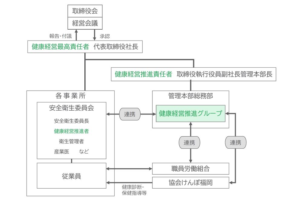 社員の健康管理を経営の重要課題と位置づけ、健康保持・増進、疾病予防を目的として、社員が心身ともに健康で、個性や能力を最大限に発揮できる職場環境の実現を目指し、健康経営を推進します。