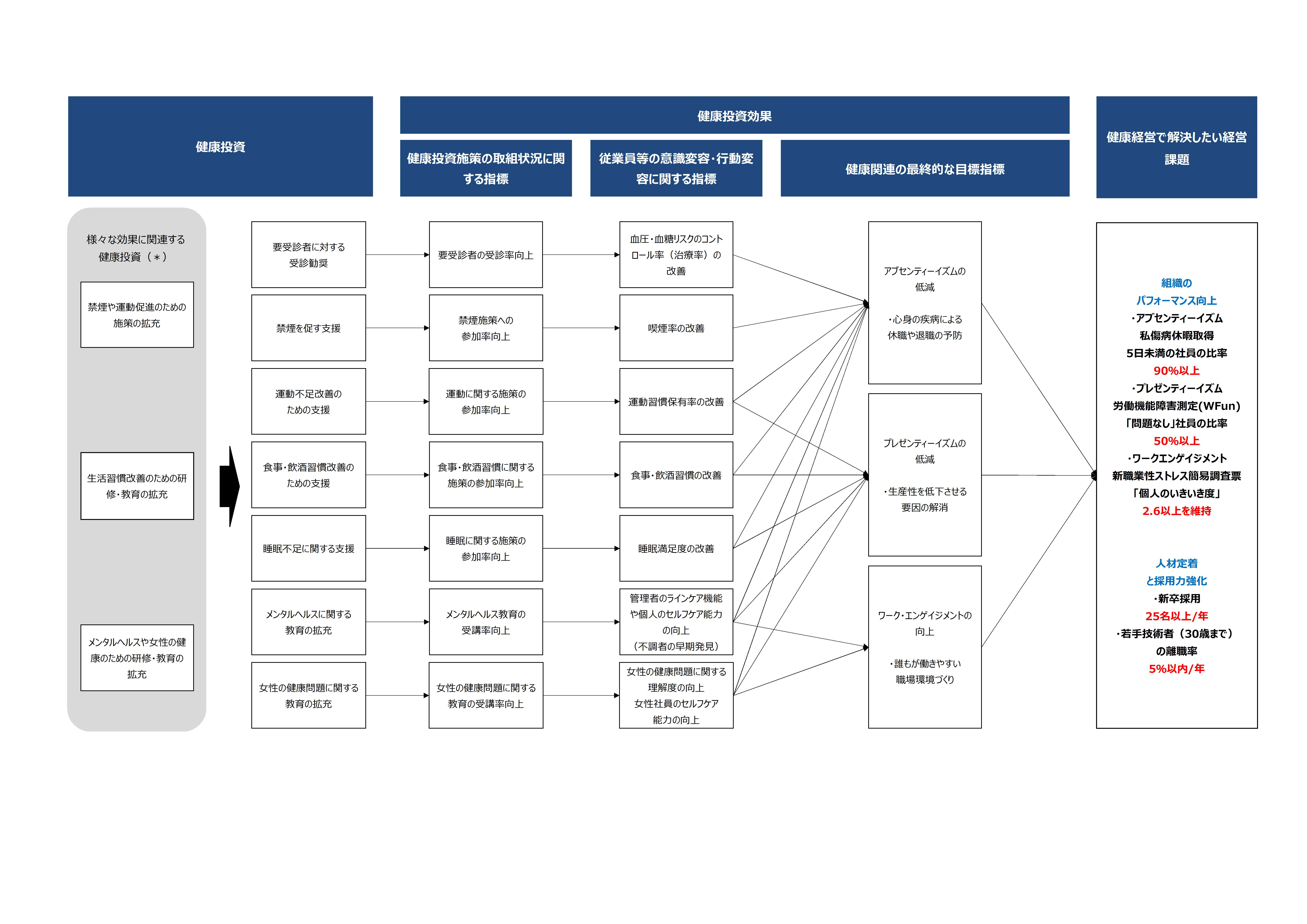 富士ピー・エスが持続的に成長し、経営理念に掲げた使命を果たすためには、経営課題である「建設業の担い手不足」を解決する必要があります。当社では、この経営課題を解決するための手段のひとつとして健康経営を推進しており、健康経営の最終目標を「組織のパフォーマンス向上」「人材定着と採用力強化」と定めております。具体的には、「アブセンティーイズム」「プレゼンティーイズム」「ワークエンゲイジメント」に関して中期的な目標値を定め、目標達成に向けた取り組みの流れを「戦略マップ」で可視化し、取締役会の承認を経て、全社展開しております。