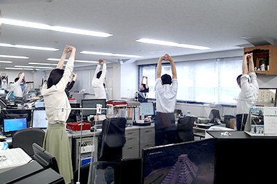 毎日15時に、5分間の当社オリジナルのストレッチプログラムを実施しています。デスクワークの「座りすぎによる生活習慣病リスクへの影響」の軽減を目的にスタートしましたが、年齢や職種ごとの健康課題にあわせて種類を増やし、現在は、肩こり改善、腰 痛改善、転倒防止など、6種類のストレッチをローテーションしております。