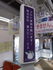 当社の社名とメッセージが記載されたオリジナルのつり革が、伊賀鉄道ふくにん列車「伊賀の四季」号に、設置されております。