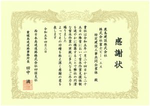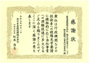 NEXCO西日本四国支社より、当社がJV参加し施工中の『松山自動車道 双海橋工事』において感謝状が授与されました。
