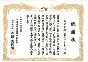 感謝状の要件としまして、北陸自動車道 敦賀IC~今庄IC間で発生した大規模な土砂流入災害の復旧工事に当たり、同社からの協力要請に応えたものです。