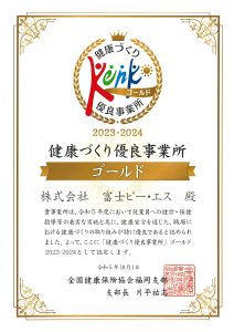 2023年10月1日付で、全国健康保険協会福岡支部より「健康づくり優良事業所ゴールド」に認定されました。