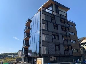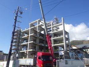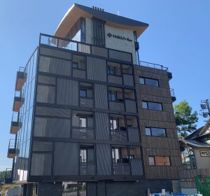 | 施工概要 | 本建物は、北海道ニセコ比羅夫坂に位置する地下1階地上7階建の高級リゾートホテルです。 階高確保のため偏平な梁形状を計画し、耐震性確保と工期短縮のためPCaPC工法が採用されました。敷地いっぱいに計画された建物のため、3工区に分割し、建て逃げ方式で架設しました。 |