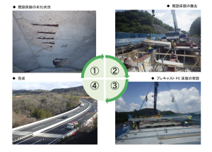 - プレキャストPC床版取替工法は、劣化した鋼橋のRC床版を取替えて高耐久化を図った更新工法です。