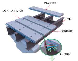 - 高度経済成長期に建設された道路橋は老朽化が進んでおり、道路橋床版の更新工事が増えています。既設の鉄筋コンクリート床版をプレキャストPC床版に取り替える際にループ継手が一般的に使用されていますが、ループ継手はループ部の最小曲げ直径によって最小床版厚が決まるため、床版厚が厚くなり死荷重が増える傾向であることが課題でした。