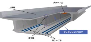 - プレテンションウェブ工法とは,現場打ちで施工されるPC箱げた橋のウェブをプレテンション方式のプレキャスト部材に置き換えて合成げたを構築する工法です。
