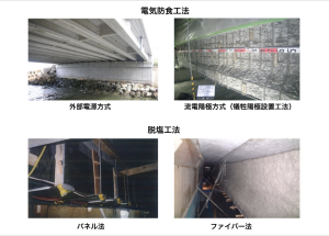- 電気化学的防食工法は、コンクリート内部の鋼材を陰極とし、コンクリート表面近傍に設けた陽極を通じてコンクリート中に直流電流を流すことにより、鋼材の腐食を抑制する工法です。電気化学的防食工法には、電気防食工法、脱塩工法、再アルカリ化工法があり、構造物の立地条件等によって工法が選定されます。