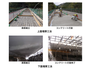 床版増厚工法は、床版の上面や下面にコンクリートを打ち足し、床版の耐荷力を向上させる工法です。一般的には、増厚部には鉄筋が配置されます。