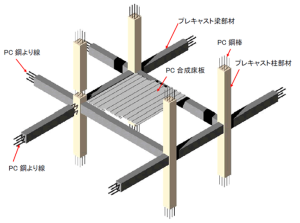 PCaPC 工法(プレキャストプレストレストコンクリート(Precast-Prestressed Concrete)工 法)とは、あらかじめ工場で製作されたプレキャスト部材(PCa 部材)を現場で揚重機などを使用 して組み立て、プレストレスを導入することでPCa 部材を圧着し躯体を構築していく工法です。
